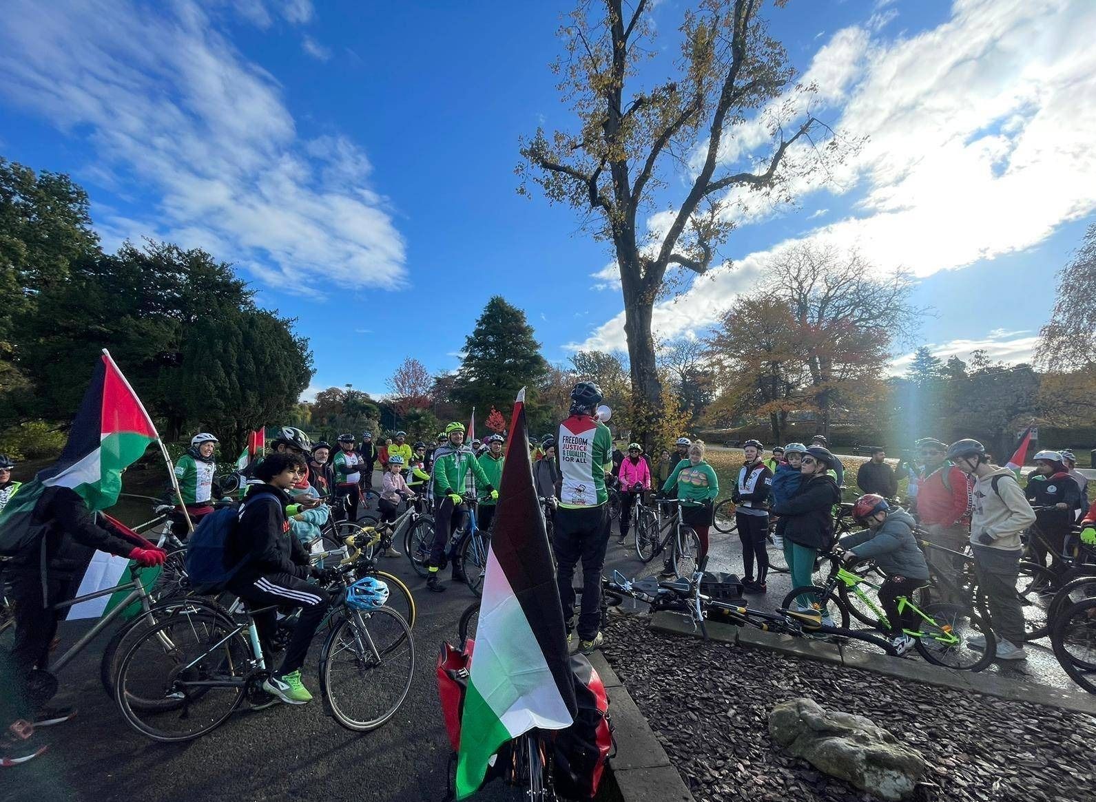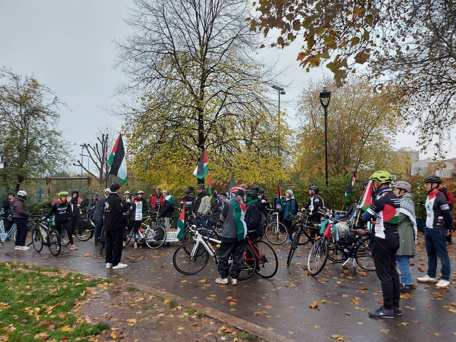 On the weekend of 4-5 November 400-500 cyclists across 6 cities took part in our first 'Ride for Gaza'. Together we rode in London and Bristol, in Birmingham, Sheffield, Swindon and Manchester. Everywhere we went we called for a 'Free Palestine' and a 'Ceasefire Now!' People along the way called out and clapped their approval, chanting with us from doorsteps and streets along the route. When we joined other protests we were welcomed enthusiastically - everyone loves to see us ride in with our bikes, flags and Palestine tops.